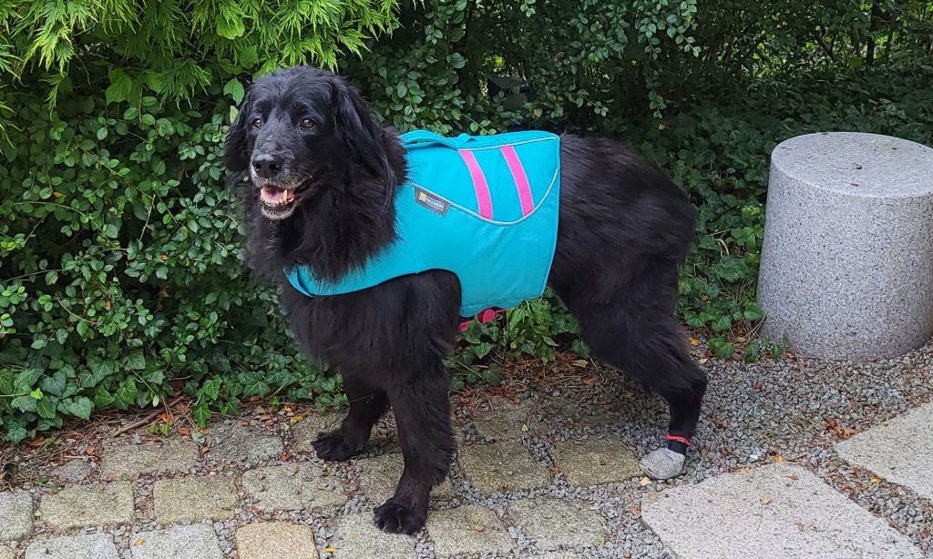 Wer mich kennt, weiß, dass ich sehr lösungsorientiert bin. Also haben wir noch am selben Tag eine Schwimmweste besorgt und am nächsten Abend gingen wir wieder zum See und ich war ausgerüstet mit Badesachen, Schwimmschuhen etc., um ihr zu helfen mit der Schwimmweste klar zu kommen. Und was macht das Mädel? – geht ins Wasser, stellt fest, dass sie sich wieder trägt und paddelt los. Mein Herz machte einen Satz und ich konnte sogar 2, 3 mal das Stöckchen werfen, das sie dann stolz wieder herausgeholt hat. Mit Schwimmweste im schicken Hellblau schwimmt sie wieder – bis heute! mit viel Spaß!